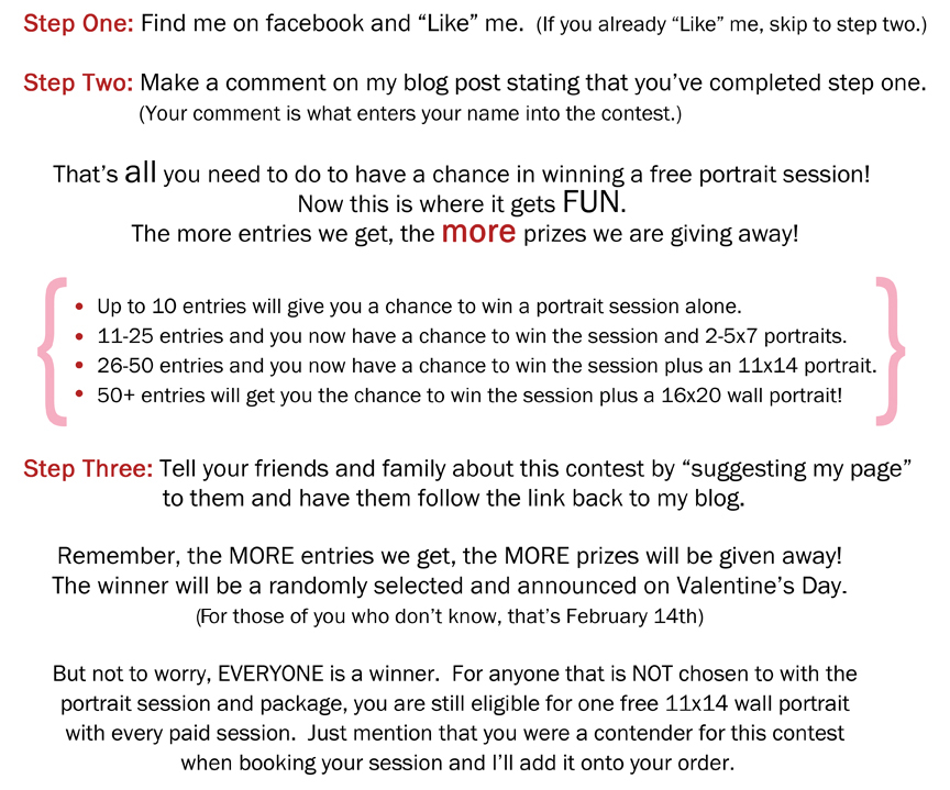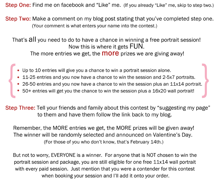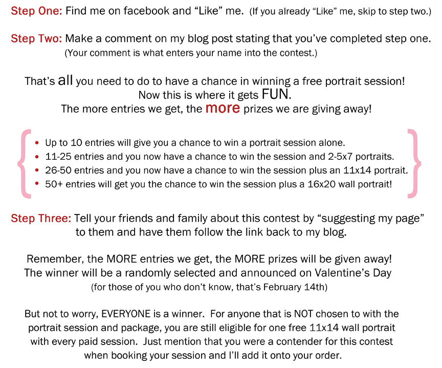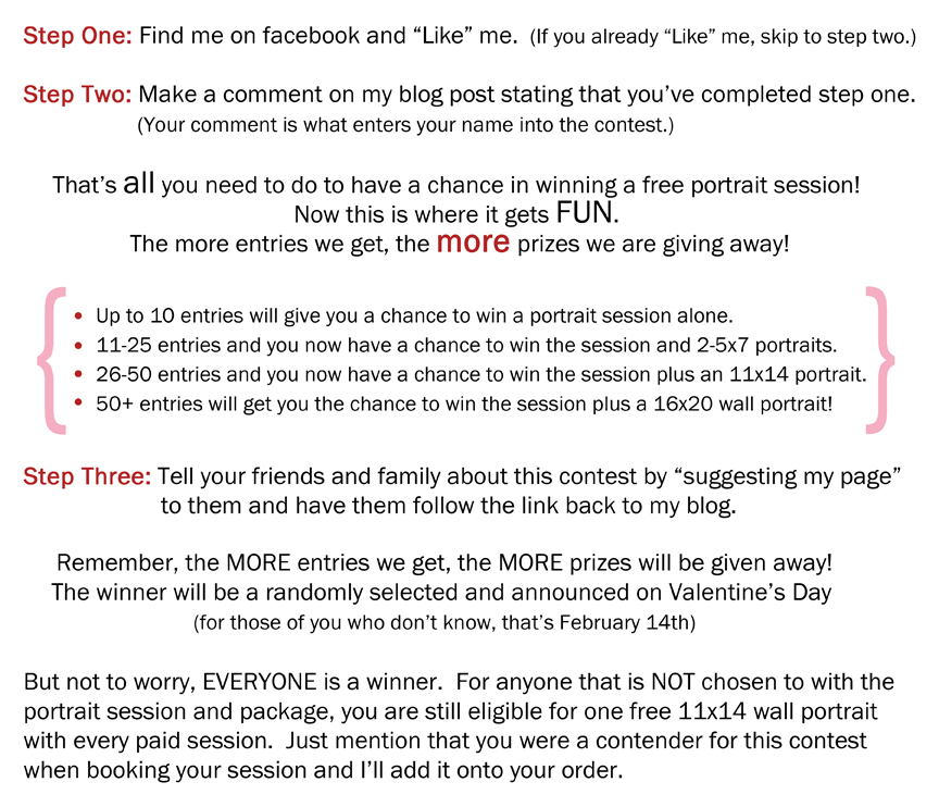 The fine print: Only one entry per person please. You must “Like” my facebook page AND make a comment on my blog post. You may use your free session for one newborn, baby, maternity, engagement, family or pet session. Contest is open to residence of Ottawa and surrounding areas only. (Unless you are willing to travel into my neck of the woods of course.) Winnings have no cash value and therefore can not be used towards previous sessions or other products. Sessions and free portraits must be redeemed in the next 6 months (Offer expires August 15th, 2011). All other portraits and sessions are available at regular prices and are listed on my website. Contest closes February 14th at 8pm EST, and winner will be announced on my facebook page. Good luck to all!!