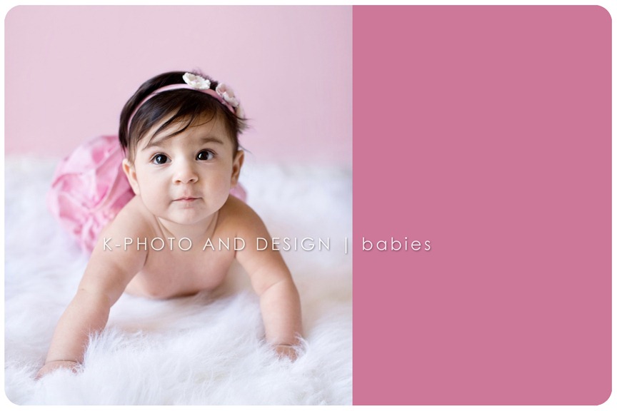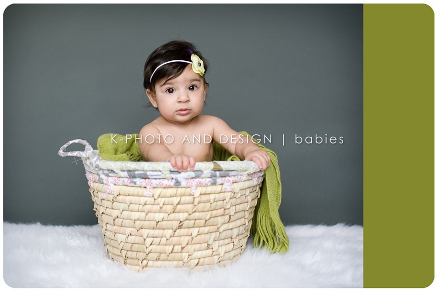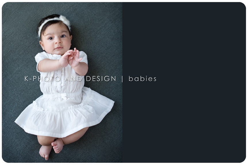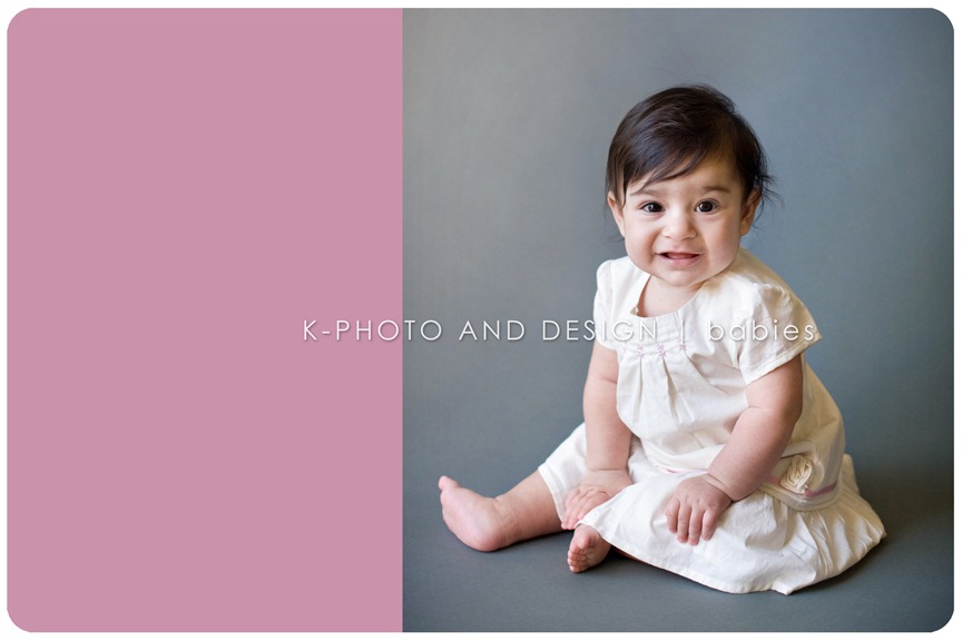 What I LOVE about a milestones package is the opportunity to meet up with these little munchkins 3 TIMES over the year!  It’s amazing how they change and learn new things so quickly.  Just look what this gal was doing at her 4 month session.  And while she STILL has those beautiful dark eyes I love so much….it’s amazing how her little personality is developing.  I was laughing so hard at her smiling at her own reflection.  With Mom, Dad, Gramma AND myself trying to get the smiles….who would have thought the funniest person was actually HERSELF! Open-mouthed smile