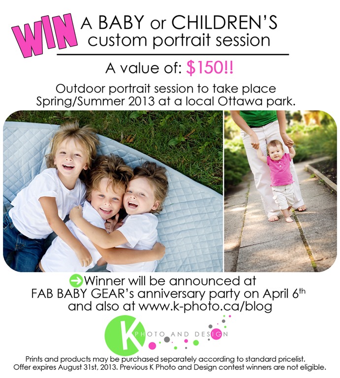 I hope everyone had fun at the FAB BABY GEAR anniversary celebration today!!  Among all of the wonderful draws, prizes and sales…there was an opportunity to WIN a baby or children’s portrait session from K Photo and Design.  So I must congratulate…