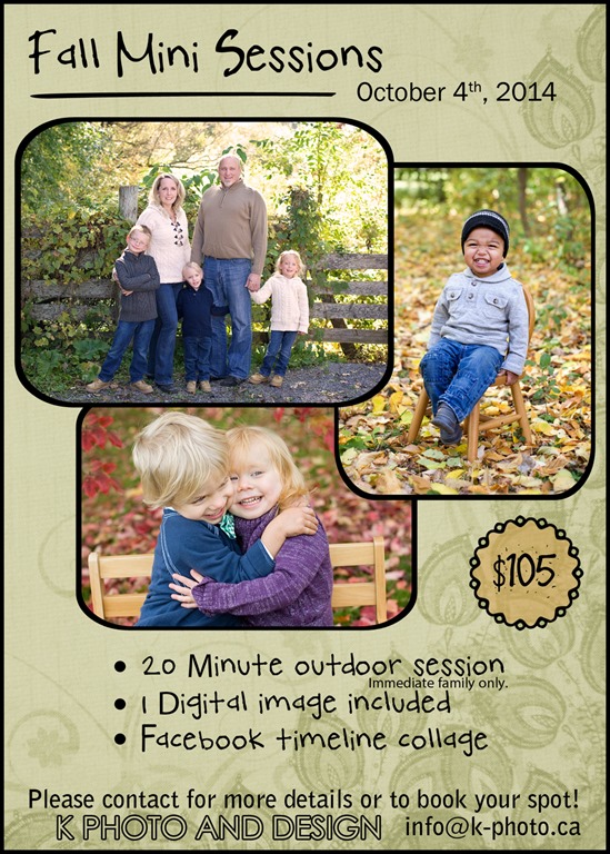 Portraits will be scheduled for October 4th, with a rain date set for the 5th.  Please contact me to book your preferred time. info@k-photo.ca  I can’t wait to meet new faces and see some old familiar ones too! Smile